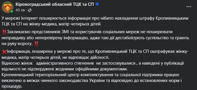 Кіровоградський обласний ТЦК спростував інформацію про нібито накладення штрафу на жінку-медика, яка звільнилась із ЗСУ через багатодітність.