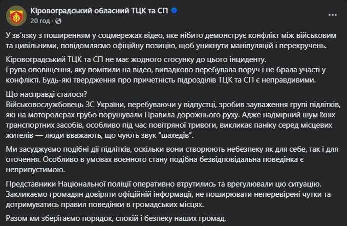 Кіровоградський обласний ТЦК та СП заявив про непричетність їхніх службовців до конфлікту з підлітками.