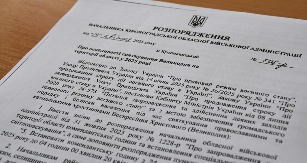Комендантську годину скоротять на Кіровоградщині у Великодню ніч. Відповідне розпорядження підписав начальник ОВА Андрій Райкович.