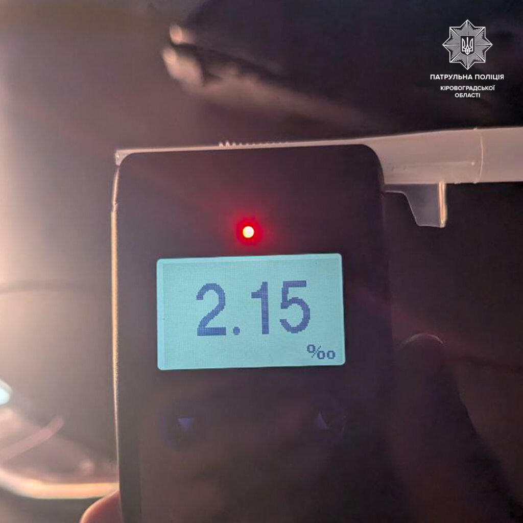 У водія виявили ознаки сп’яніння. Порушник не заперечував, що вживав оковиту. Результат приладу Драгер показав 2,15 проміле.